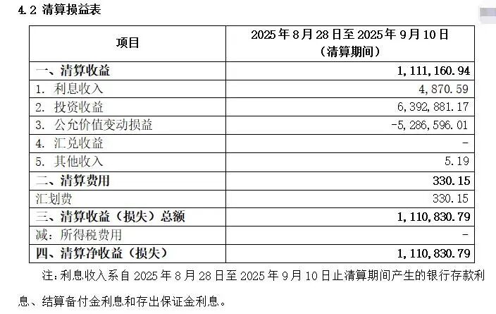 报告截止日2025年8月27日(最后运作日),基金份额总额42,085,398.92份,其中A类基金份额净值1.1802元,基金份额总额23,285,454.15份;C类基金份额净值1.1658元,基金份额总额18,799,944.77份。该只基金清算净收益111.08万元。
